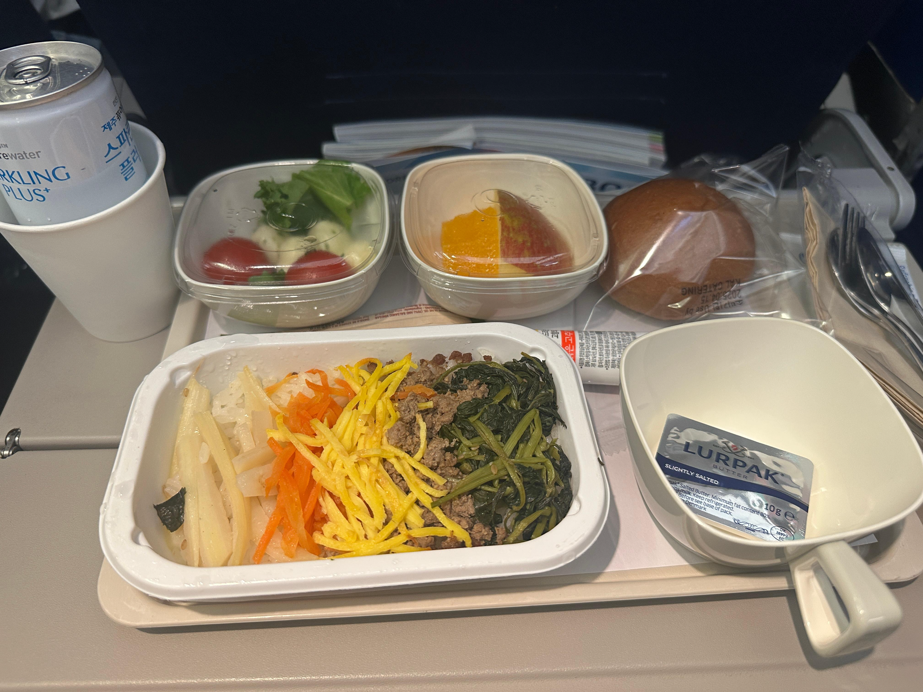 평소 보고 싶었던 '나의 해리에게'를 보다가 골아 떨어졌는데, 기내식 때문에 깼습니다 ㅎㅎ '대한항공은 비빔밥이지'를 속으로 외치며 비빔밥을 선택했고, 라운지에서 열심히 먹은 댓가로 많이 남겼습니다ㅠㅠ.. 비빔밥도 비빔밥이지만, 생치즈를 발사믹&엑스트라 버진 올리브 오일과 함께 먹는 샐러드가 짱 맛있었습니다..! 탄산수를 선택하니 아예 캔으로 주셔서 더 좋았고요!