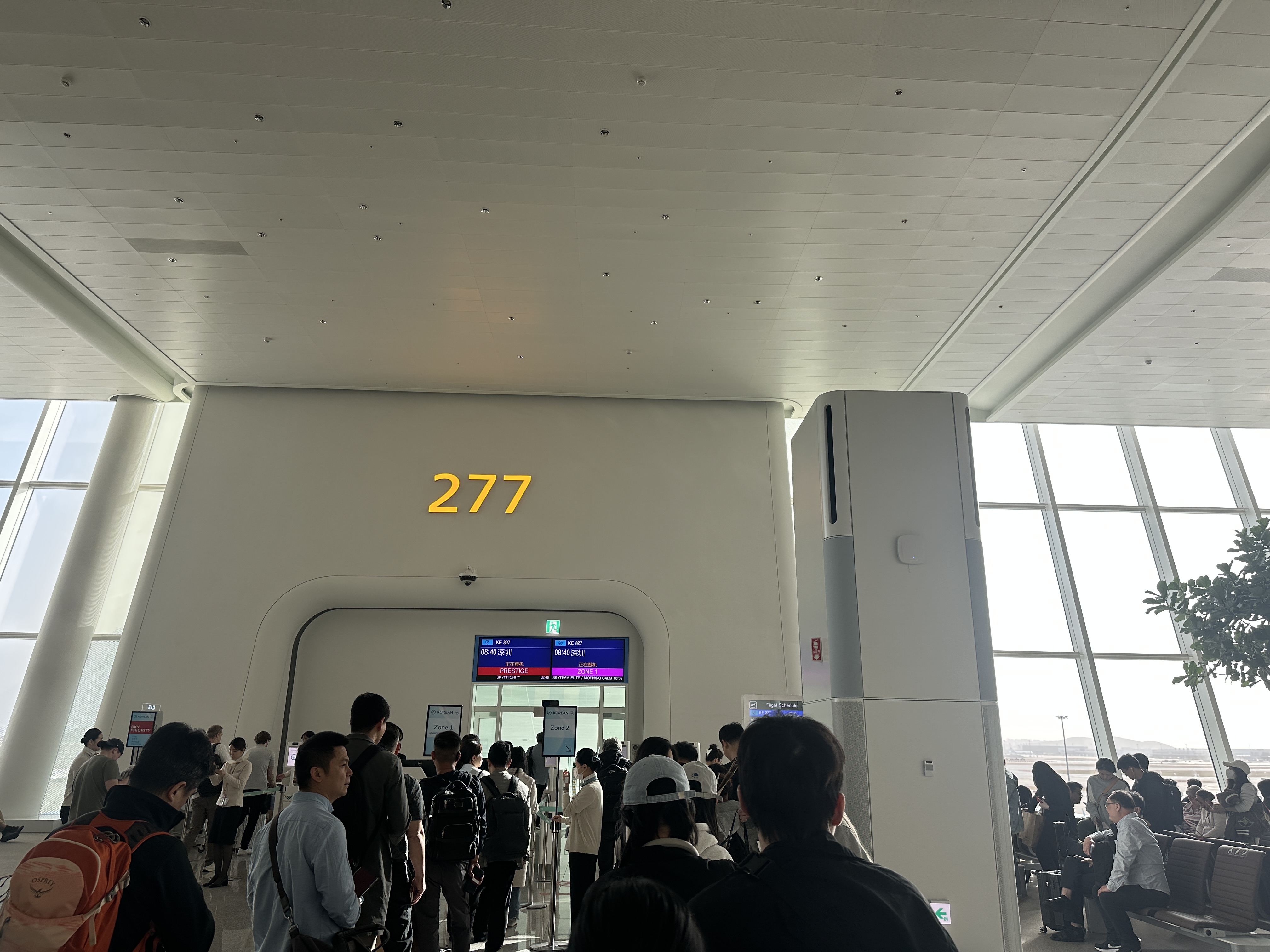 선전으로 가는 직항 비행기인 대한항공 KE827편을 탔습니다. 오전 8시 40분에 출발해 3시간 50분을 날아가 현지시간으로 오전 11시 35분에 도착하는 비행기였습니다. 탑승구가 277로, 좀 멀어서 가는데 약간의 시간이 걸렸으니, 조금 여유롭게 도착하시는 것을 추천합니다!